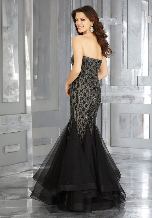 Madeline Gardner, Evening Dress style 71636. Stunning Gunmetal Beading on a Lace and Tulle Black Mermaid Special Occasion Gown. Sweetheart Neckline, glamorous and elegant.Perfect for any Formal event and Mother of the Bride.