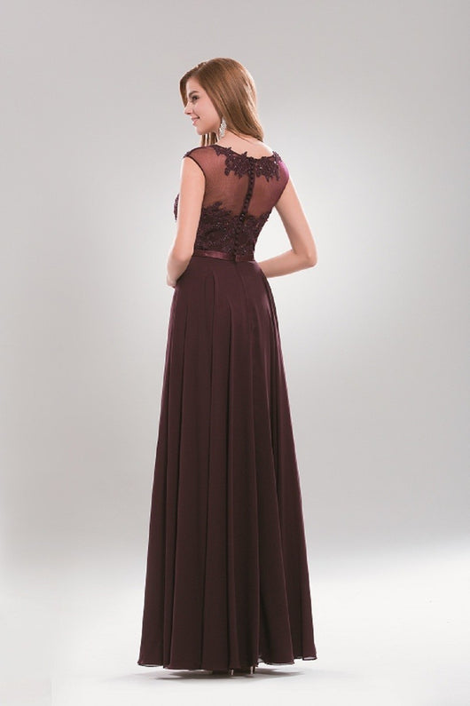 A line dress with a high neckline and cap sleeves.Lace embellishments adorn the bodice. Illusion buttons down the zipper.Satin belt outline the waistline. and releases a Pleated A Line skirt