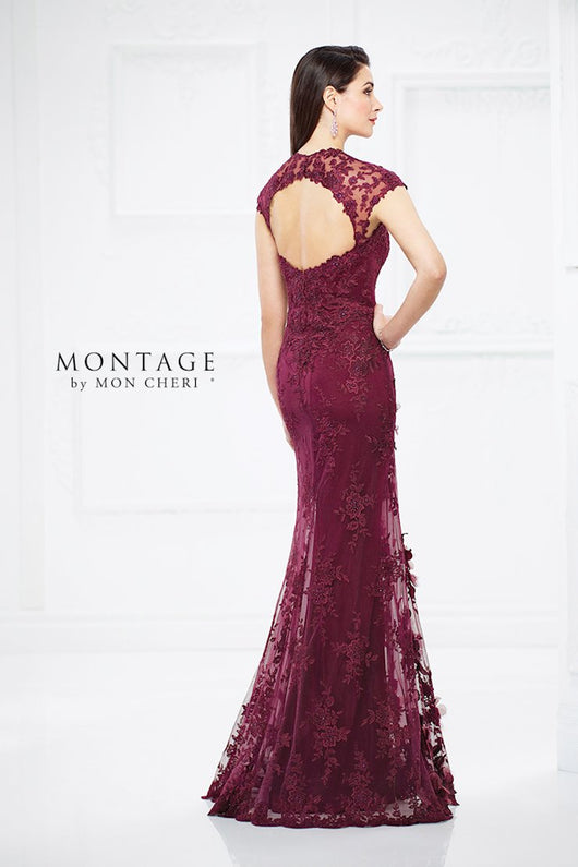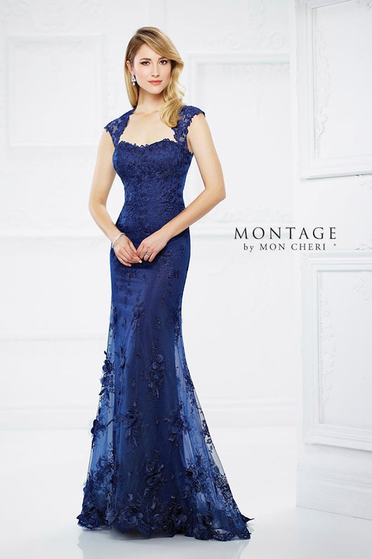 Lace and tulle fit and flare gown with cap sleeves, soft Queen Anne neckline, lace bodice with dropped waist, illusion lace back with large keyhole, tulle overlay skirt with lace appliques and three-dimensional flower accents, sweep train.