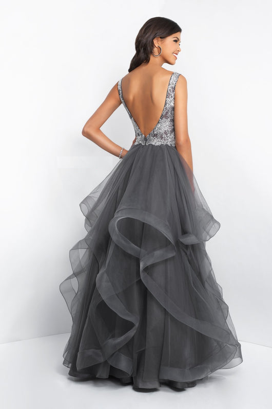 Horse hair tiered ball gown skirt with heavy beaded V-neckline bodice.