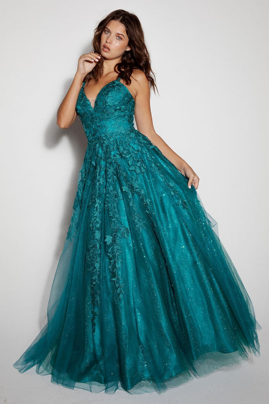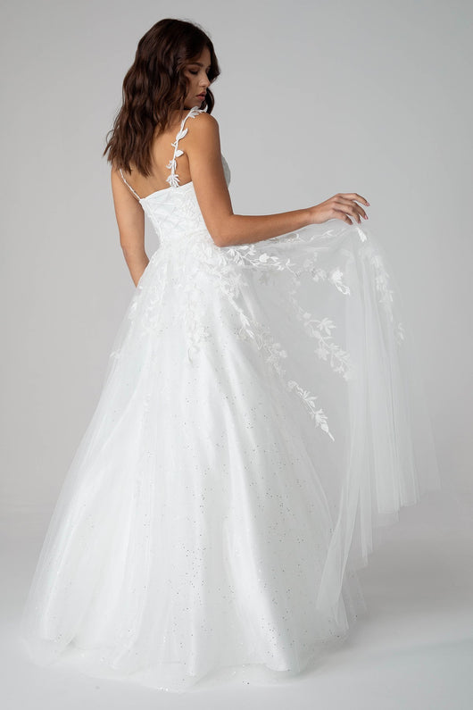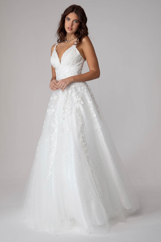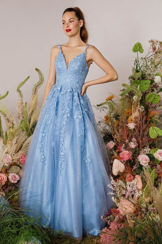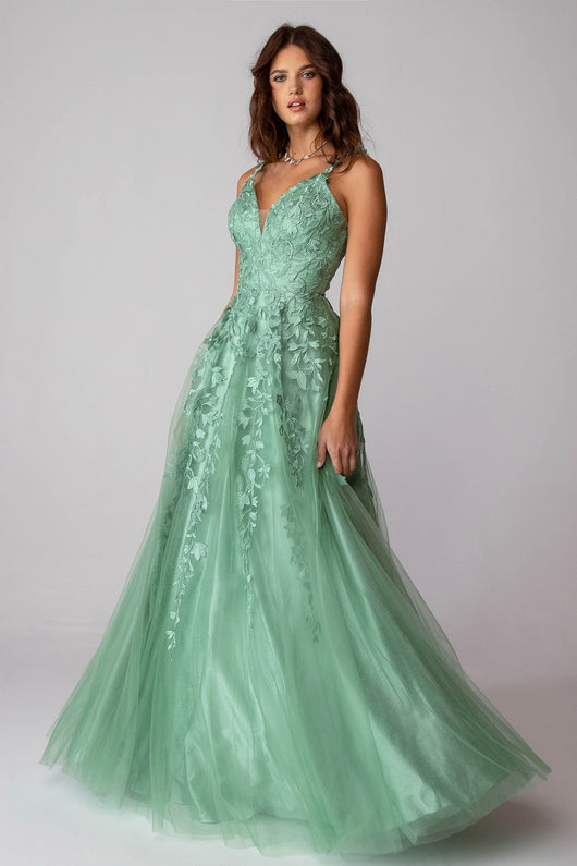Elegant and lovely prom dress with 3D lace embroidery adorning the bodice and cascading to the A-line mesh glitter shimmer underlay skirt. The v-neckine dress finishes with a corset back.