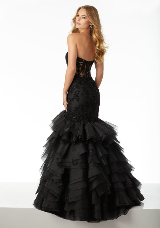 Sexy Mermaid wedding Gown Featuring a Sheer Boned Lace Bodice and Full, Ruffled Tulle and Organza Skirt. Detachable Bodice Lining Included. Colors Available: Champagne, Black