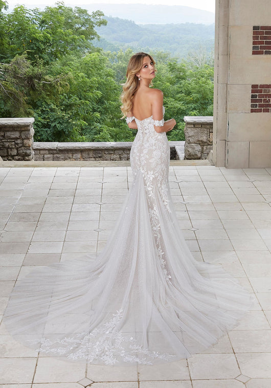 This wedding dress is a sultry mermaid full of dramatic details. The sheer, corset bodice features a romantic sweetheart neckline and gorgeous crystal beaded, embroidered appliqués that beautifully cascade down the gown. Sparkle net creates an effervescent twinkling effect while the godet skirt adds incredible texture to the sheer train as you walk down the aisle. Detachable off-the-shoulder sleeves with three-dimensional floral appliqués add a touch of whimsy to the look.